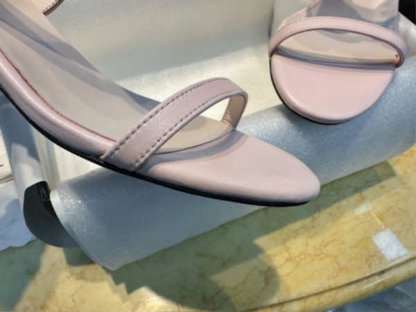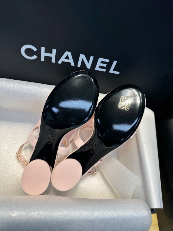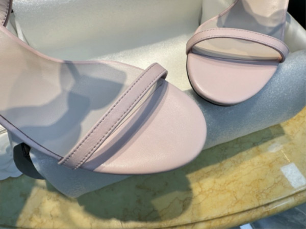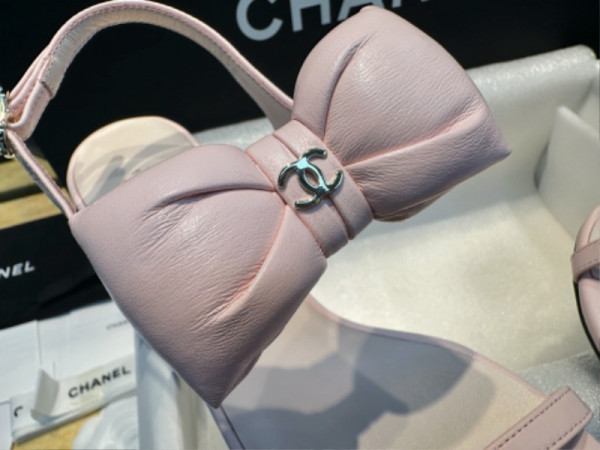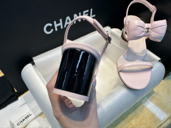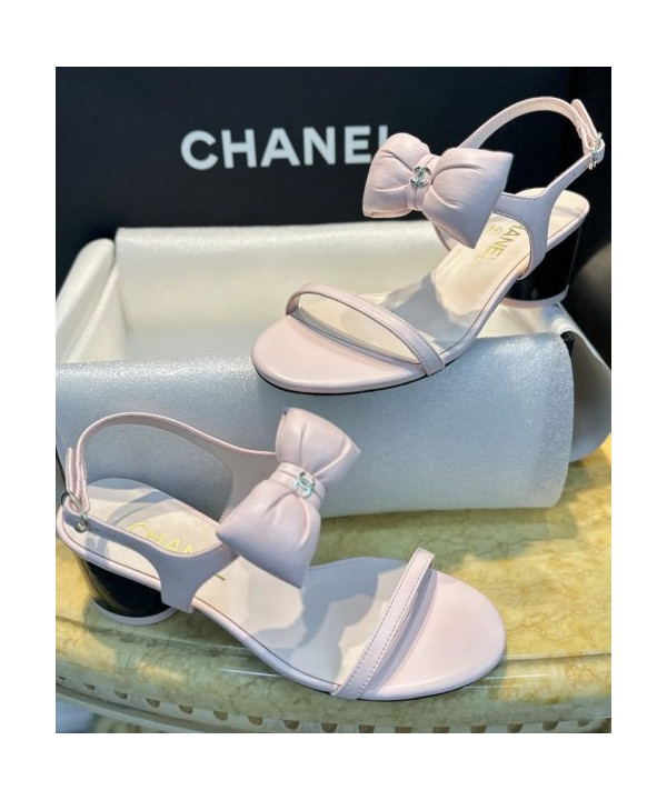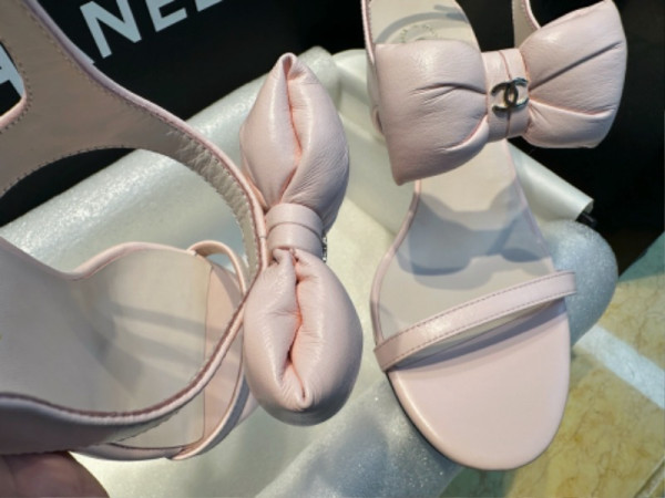 샤넬 리본 스트랩 미들힐 핑크 샌들