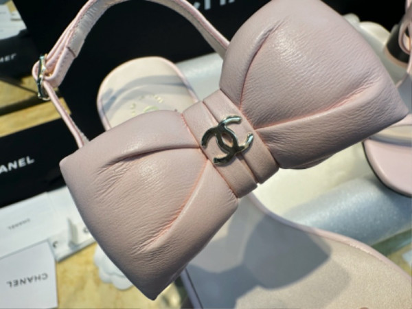 • 샤넬 리본 스트랩 미들힐 핑크 샌들