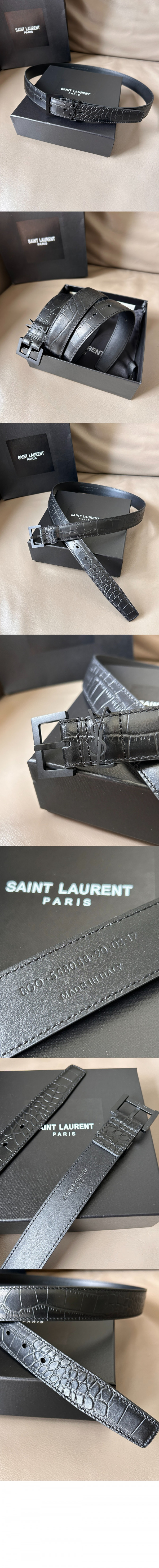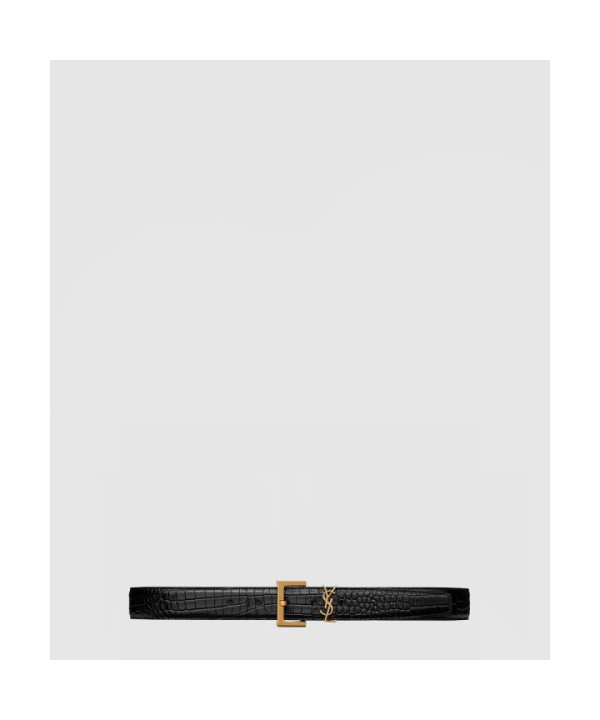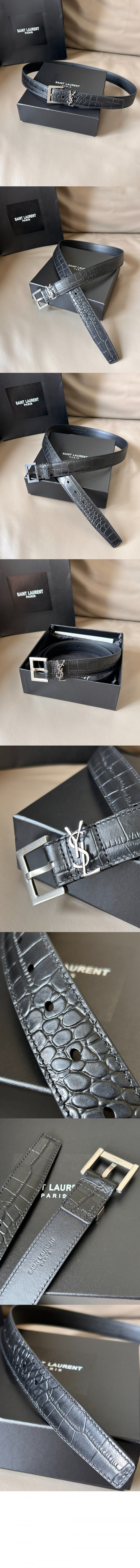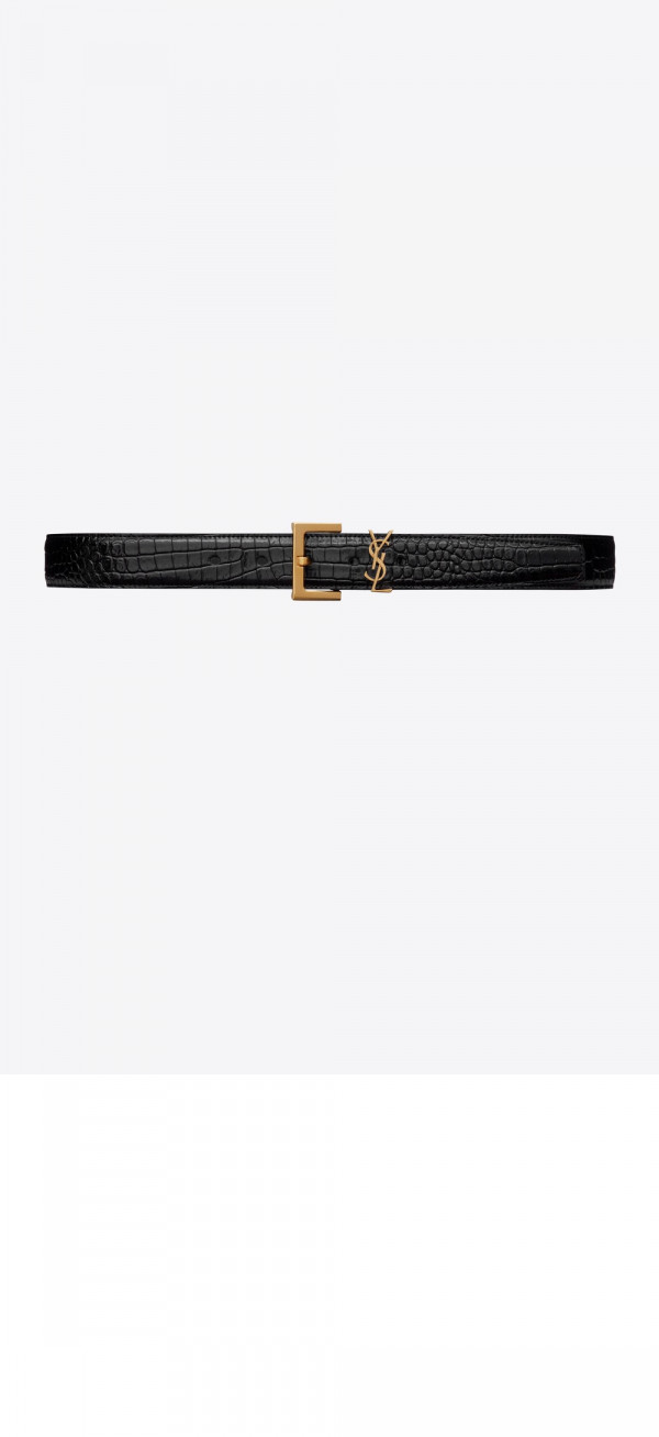 • 생로랑 스퀘어 버클을 장식한 유광 크로커다일 엠보스드 가죽 소재의 벨트 634437