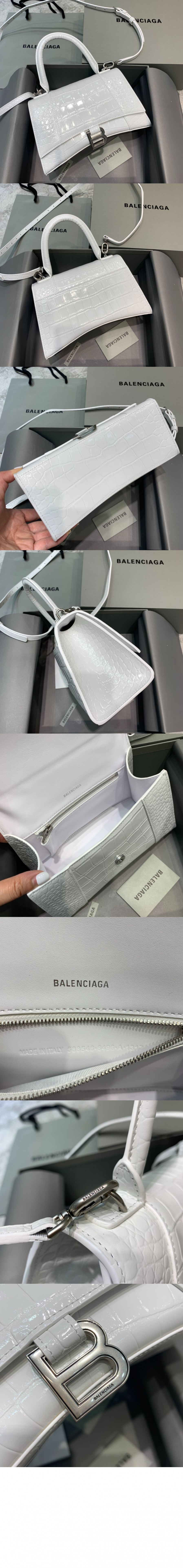 발렌시아가 아워글래스 XS 크로커다일 엠보싱 핸드백 화이트 593546 > 여자
