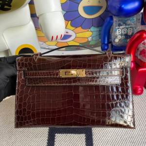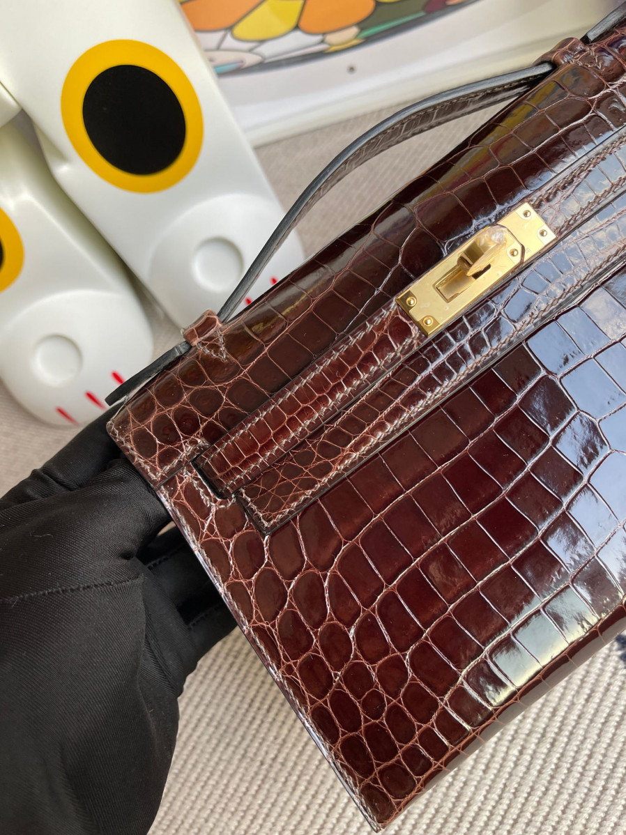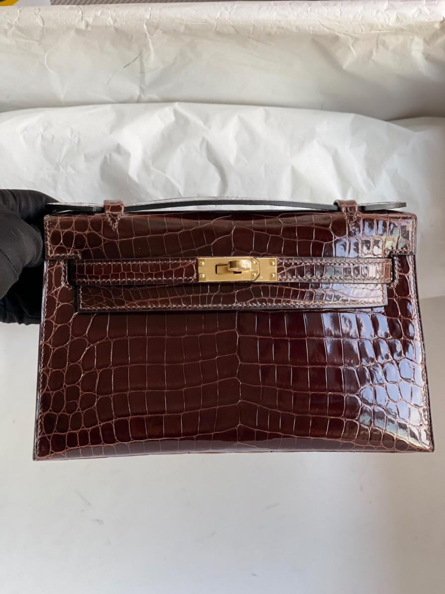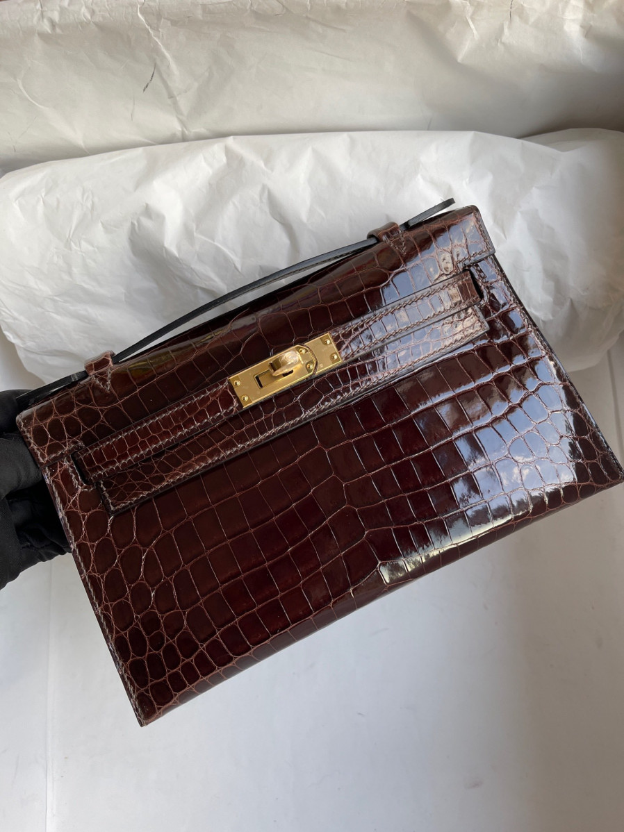 에르메스 켈리 포쉐트 브라운 금장 샤이니 악어가죽