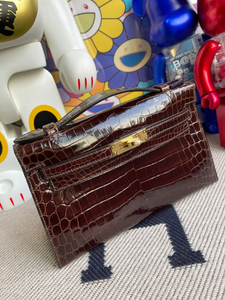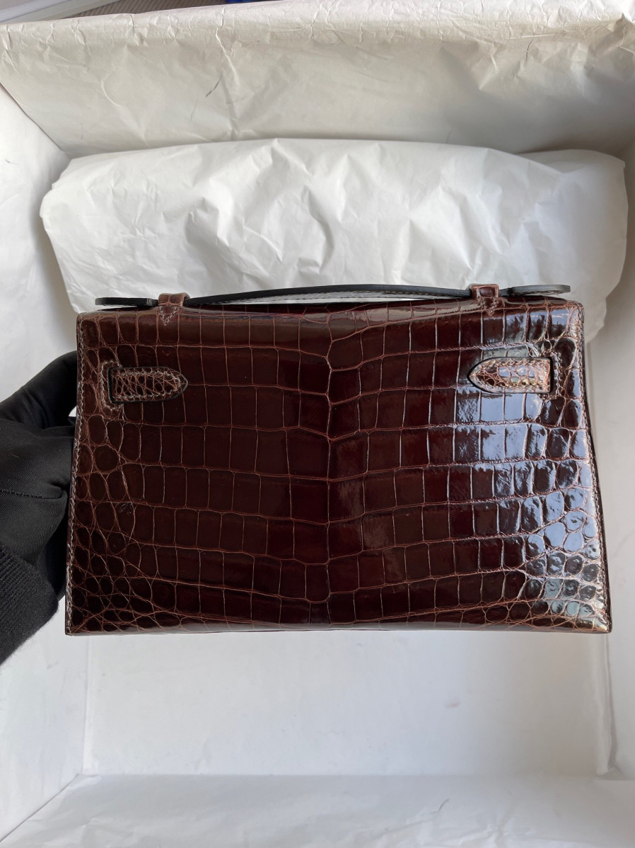 에르메스 켈리22 포쉐트 브라운 금장 샤이니 악어가죽