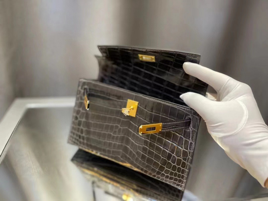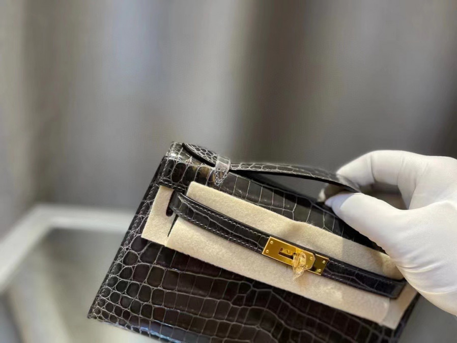 에르메스 켈리 포쉐트 브라운 금장 샤이니 악어가죽